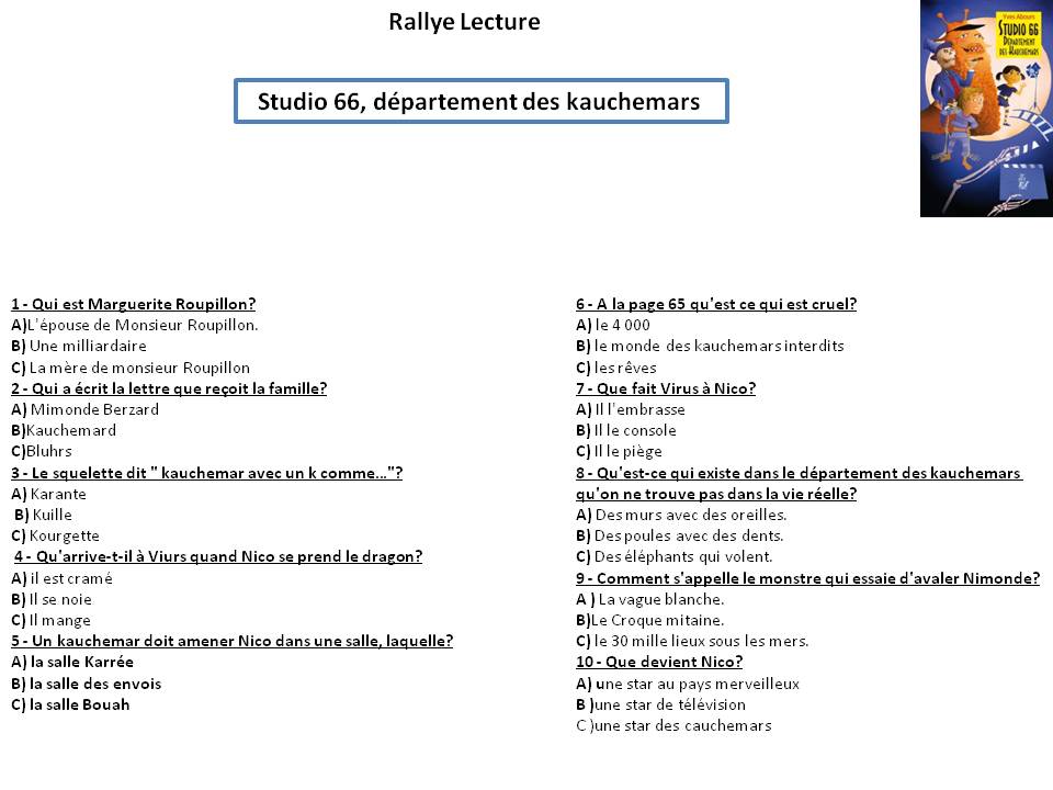 Publié le 21 avril 2020 Dans ce document vous retrouvez le questionnaire concernant votre livre qui vous permettra de répondre par A,B ou C à la fiche tableau de la fiche de lecture. Par : NathalieLittérature