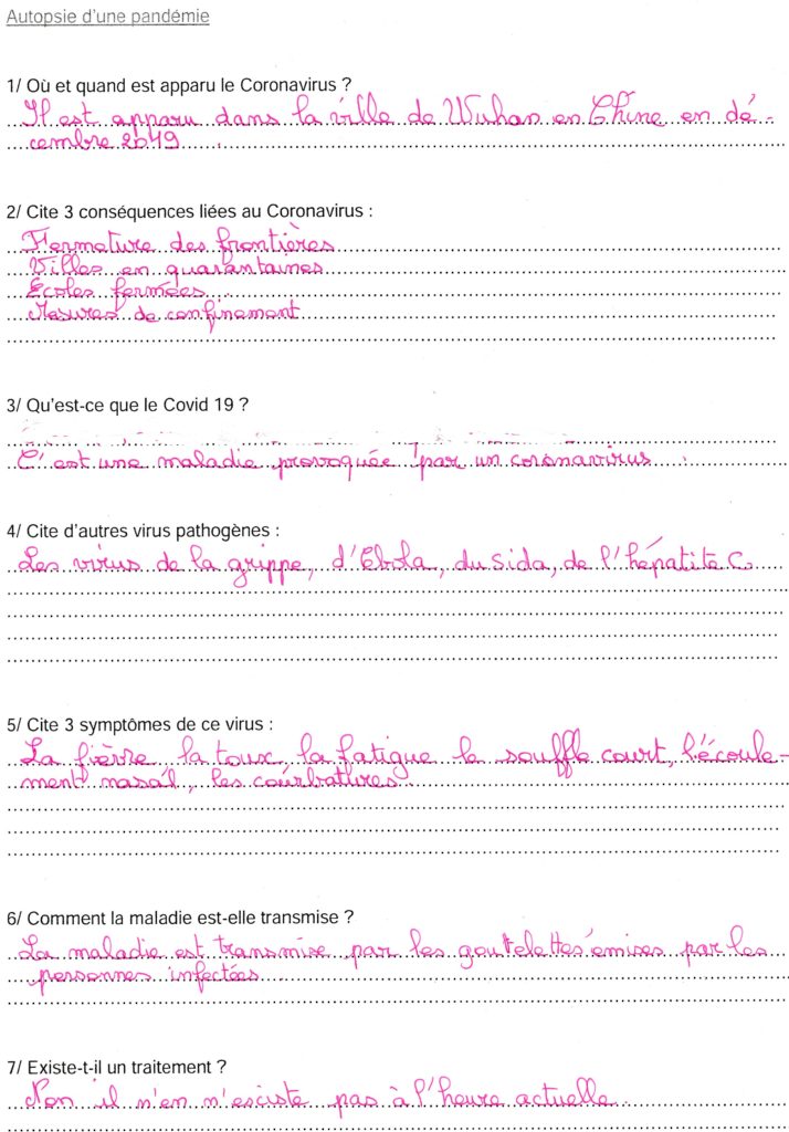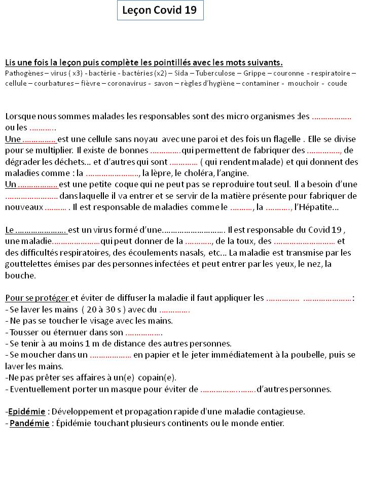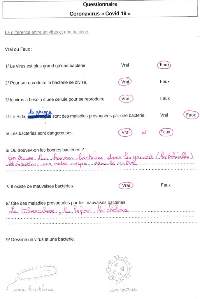 Ci joint la correction du questionnaire et leçon à compléter et à apprendre. Vous devez être capable de faire la différence entre un virus et une bactérie, une épidémie et une pandémie, connaitre des maladies virales ou bactériennes et les moyens de protection mis en place dans le cadre du covid 19.
